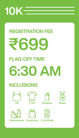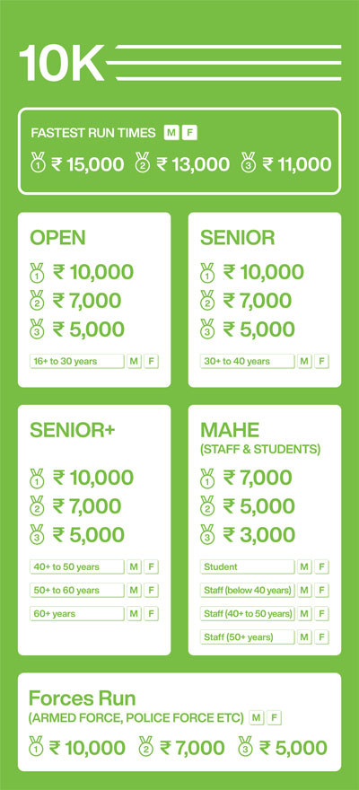 10K Run - OPEN: 16+ yrs to 30 yrs; SENIOR: 30+ yrs to 40 yrs; SENIOR+: 40+ yrs to 50 yrs, 50+ yrs to 60 yrs and 60+ yrs and above (Men & Women)