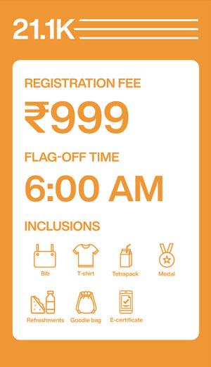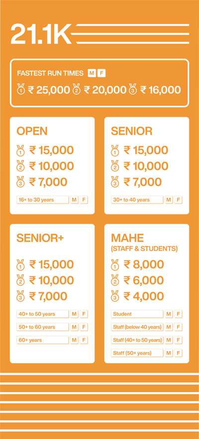 21.1K Run - OPEN: 16+ yrs to 30 yrs; SENIOR: 30+ yrs to 40 yrs; SENIOR+: 40+ yrs to 50 yrs, 50+ yrs to 60 yrs and 60+ yrs and above (Men & Women)