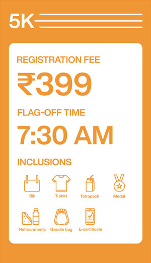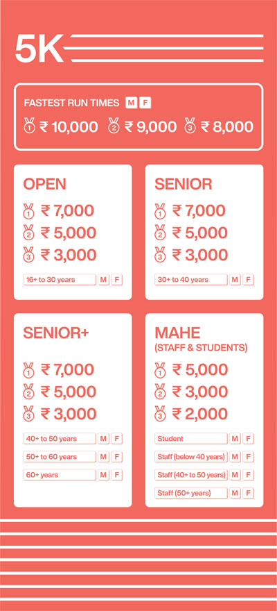 5K Run - OPEN: 16+ yrs to 30 yrs; SENIOR: 30+ yrs to 40 yrs; SENIOR+: 40+ yrs to 50 yrs, 50+ yrs to 60 yrs and 60+ yrs and above (Men & Women)